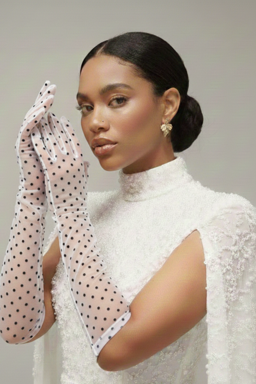 Dare to stand out from the crowd with this playful and eye-catching fashion statement. Perfect for any occasion, these elbow length polka dot lace gloves are a must-have for anyone who loves taking fashion risks!
