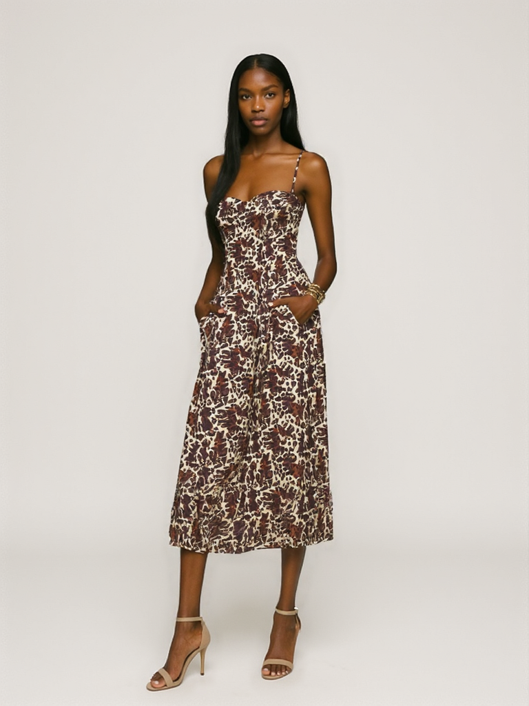 Command attention in the Savanna Siren Midi Dress, a sultry yet sophisticated take on safari-inspired style. Featuring a rich, earthy animal print in deep mahogany and ivory tones, this corset-style bodice flatters with adjustable spaghetti straps and a subtle sweetheart neckline. The structured silhouette flares into a soft A-line midi skirt, complete with hidden pockets for that perfect blend of polish and practicality.